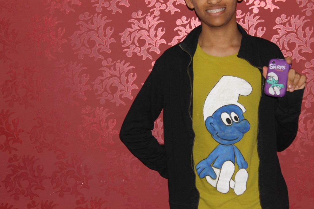 وأخيراً حصلتُ على سنفوري الخاص بي : ) ، هذه المحاولة الأولى للرسم على التيشيرت ، حقيقةً كانت تجربة ظريفة فكنتُ كالذي يختبر ولا يدري ما الإجابة الصحيحة ؟ كنت ألوّن الفراغات بيدان مرتعشان الأمر الذي جعلني ألوّن ضاحكة ! : )