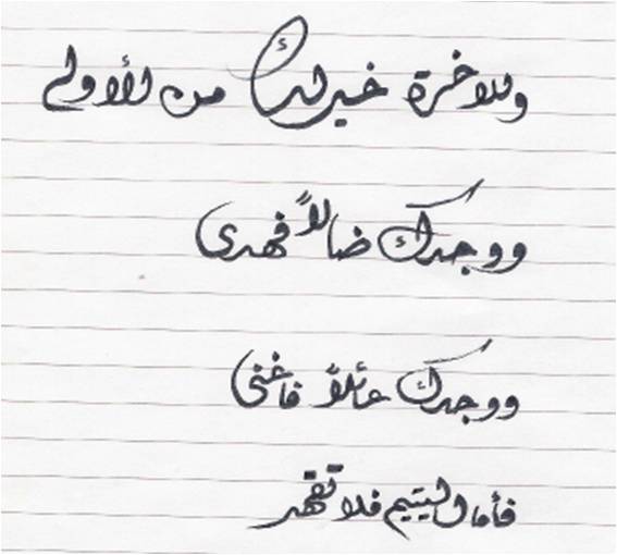 أخبرتني غير مرّة كمْ أنّ خطي جميل ويروقها لكن ينقصه أن يكبر أكثر ! أخبرتها بأنه غير قابل لأن يكبر فقد كبرتْ صاحبته وهو ما زال يحبو ! أجابتني بأن أتعلم في الإجازة بأن أكبّر خطي أكثر ، ولأول أول آخذ أمر تكبير الخط على محملٍ الجدّ ، قررتُ مُذ ذلك الوقت أنني سأخصص وقتاً لهذه المهمة العسيرة الشاقة البئيسة التعيسة !